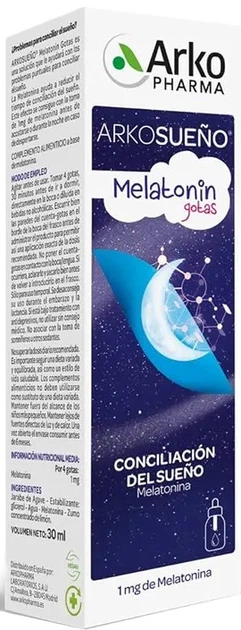 Krople z melatoniną Arkosueno 30 ml zawierają melatoninę, składnik, który, jak wykazano, pomaga skrócić czas zasypiania. To suplement diety wolny od konserwantów chemicznych.