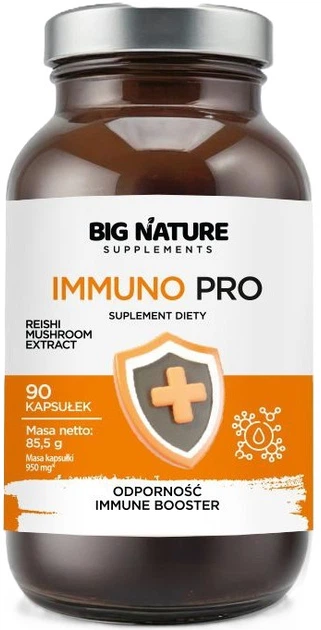 Immuno Pro to suplement opracowany z myślą o wsparciu naturalnej odporności organizmu. W jego skład wchodzą starannie dobrane składniki aktywne, takie jak Reishi, dzika róża, oliwka europejska, cynk i witamina D3, które wspierają prawidłowe funkcjonowanie układu odpornościowego, pomagają w ochronie komórek przed stresem oksydacyjnym oraz poprawiają ogólną kondycję organizmu. Reishi (lakownica żółtawa) jest grzybem o silnym działaniu wzmacniającym organizm, który wspiera naturalną odporność, a także pomaga w walce ze stresem. Dzika róża, znana przede wszystkim z wysokiej zawartości witaminy C, wzmacnia układ odpornościowy, poprawiając jego reakcję na infekcje. Oliwka europejska ma działanie antyoksydacyjne, chroniąc komórki przed uszkodzeniem, a cynk oraz witamina D3 wspomagają prawidłową funkcję układu odpornościowego i przyczyniają się do lepszej odpowiedzi na infekcje.
