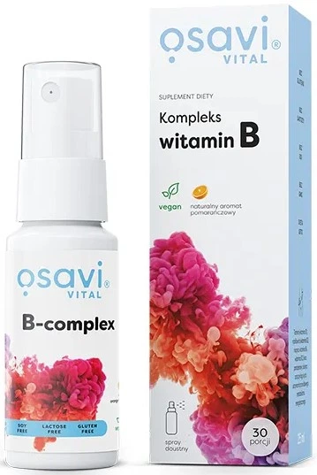 Suplement diety z witaminami z grupy B to spray doustny z ksylitolem (zawiera substancję słodzącą), z naturalnym aromatem pomarańczowym.