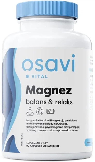 Osavi Magnez Balans & Relaks to suplement diety w kapsułkach roślinnych, zawierający kompleks składników: magnez, witaminę B6, cynk w formie OptiZinc oraz kwas L-asparaginowy (300 mg) w dziennej porcji 3 kapsułek.