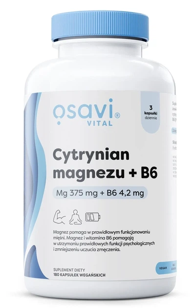 Osavi Cytrynian Magnezu + B6 to suplement diety w kapsułkach roślinnych zawierający 375 mg magnezu w postaci cytrynianu oraz 4.2 mg witaminy B6 w aktywnej formie P-5-P (5′-fosforan pirydoksalu). Produkt został opracowany z myślą o codziennym uzupełnianiu diety w te dwa istotne składniki.
