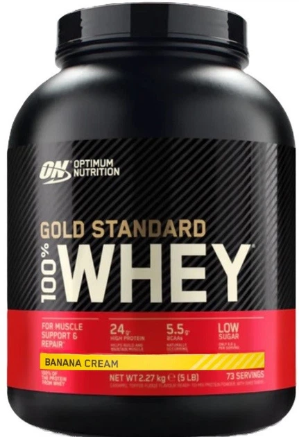Whey Gold Standard – високоякісна білкова добавка, що містить 82% білка, приблизно 24 г у порції. Продукт поєднує ізолят, концентрат та гідролізований ізолят сироваткового білка, забезпечуючи 100% білків виключно сироваткового походження. Формула сприяє підтримці анаболічного середовища, а присутність пептидів сироваткового білка та швидка засвоюваність підвищують ефективність дії.