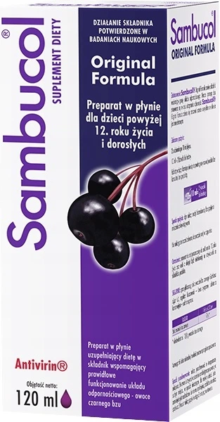 Sambucol Original Formula to suplement diety w formie syropu, przeznaczony dla młodzieży powyżej 12 roku życia oraz dorosłych. Zawiera ekstrakt z owoców czarnego bzu (Sambucus nigra), które tradycyjnie wspierają układ odpornościowy, zwłaszcza w okresach zwiększonego ryzyka infekcji, takich jak sezon jesienno-zimowy. Syrop wykazuje właściwości antyoksydacyjne i pomaga łagodzić objawy przeziębienia oraz kaszlu.